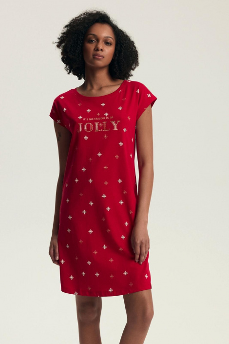 Świąteczna koszula damska z wysokiej jakości bawełny, wzór w śnieżynki, dekolt okrągły, krótki rękaw, z przodu ozdobny złoty nadruk z napisem "JOLLY", długość przed kolano, - pakowana w foliowy woreczek.
