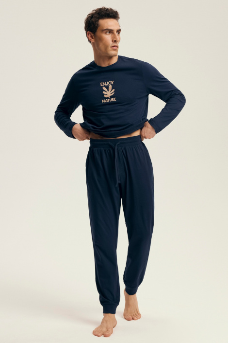 Bawełniana piżama męska, bluza z długim rękawem, dekolt okrągły, z przodu stylowy nadruk, do kompletu długie spodnie, w pasie szeroka, wygodna guma z regulowanym troczkiem, na biodrach kieszenie, nogawki zakończone ściągaczem, pakowana w pudełko.