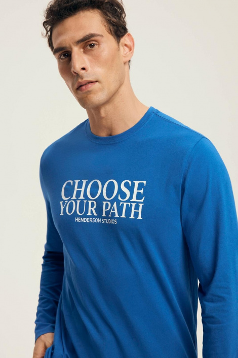 Bawełniana piżama męska, bluza z długim rękawem, dekolt okrągły, z przodu ozdobny nadruk, do kompletu długie spodnie, w pasie szeroka, wygodna guma z regulowanym troczkiem, na biodrach kieszenie, nogawki zakończone ściągaczem, pakowana w pudełko. Skład: 100% bawełna